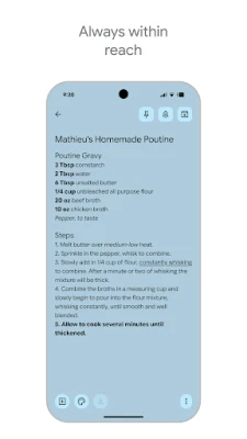 Vaše misli su uvek uz vas. Google Keep je dizajniran da radi savršeno na svim vašim uređajima – telefonima, tabletima, računarima i Wear OS satovima. Sve što zabeležite automatski se i besprekorno sinhronizuje, garantujući da su vaše ideje i podsetnici uvek dostupni, gde god da se nalazite. Nikada više ne propustite važan zadatak uz pametne podsetnike: podesite ih na osnovu vremena ili, još bolje, na osnovu lokacije. Na primer, Google Keep može da vam prikaže vašu listu za kupovinu čim stignete u prodavnicu.