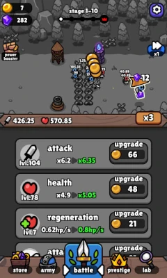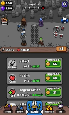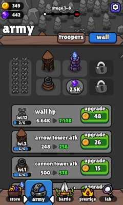 Iron Wall nudi dubok i nagrađujući sistem napredovanja. Iskoristite "Prestige" mehanizam da restartujete svoje putovanje za bonuse u zlatu, zadržavajući pritom svoja ključna poboljšanja, čime svaki novi pokušaj postaje prilika za strateško osmišljavanje i jačanje. Posetite "Research Lab" kako biste globalno unapredili sve svoje jedinice putem najsavremenijih tehnoloških istraživanja, osiguravajući da vaša vojska uvek bude korak ispred. Bez obzira da li ste opušteni branilac ili iskusni strateg, Iron Wall obećava izazove i zadovoljstvo. Optimizujte svoj tim, usavršite svoju taktiku i postanite krajnji čuvar zida.