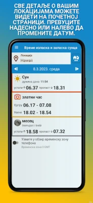 Пратите прецизна времена изласка и заласка сунца за сваку локацију. Сазнајте дужину дана и фазе месеца. Откријте златни сат, савршен за фотографије због мекше, црвеније светлости. Добијајте обавештења о почетку ових тренутака.