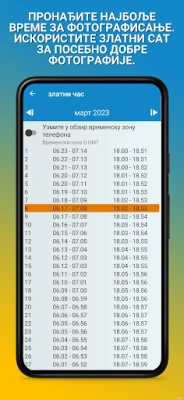 Poseban fokus stavljen je na "Zlatni sat", period koji fotografi i ljubitelji lepote obožavaju zbog svoje jedinstvene, meke svetlosti. Uz ovu aplikaciju, uvek ćete znati kada nastupa taj čarobni interval, bilo da planirate fotografisanje, romantičan susret ili jednostavno želite da upijete lepotu trenutka. Kako biste uvek bili korak ispred, aplikacija nudi praktična dnevna obaveštenja direktno na vašem uređaju. Primajte podsetnike za nadolazeći izlazak ili zalazak sunca, kao i za početak Zlatnog sata, omogućavajući vam da optimalno iskoristite svaki dan. Neka vam nebo bude savršen pratilac u svim vašim avanturama!