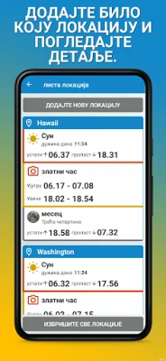 Koristeći naprednu GPS tehnologiju, aplikacija automatski određuje vašu trenutnu poziciju, pružajući vam tačne podatke o vremenu izlaska i zalaska sunca, kao i mesečevih faza. Niste ograničeni samo na jedno mesto; lako možete dodati i pratiti više omiljenih lokacija, što je idealno za planiranje putovanja ili za praćenje dešavanja na različitim destinacijama. Detaljan prikaz vremena izlaska i zalaska meseca dodaje novu dimenziju vašem doživljaju prirode, omogućavajući vam da u potpunosti uživate u svakom nebeskom spektaklu.